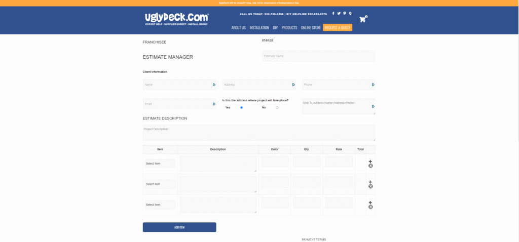 To help dealers bid and keep track of their projects, UglyDeck.com has invested in an online estimating tool. This online resource is easy to use, doesn’t require extensive training, and saves time!