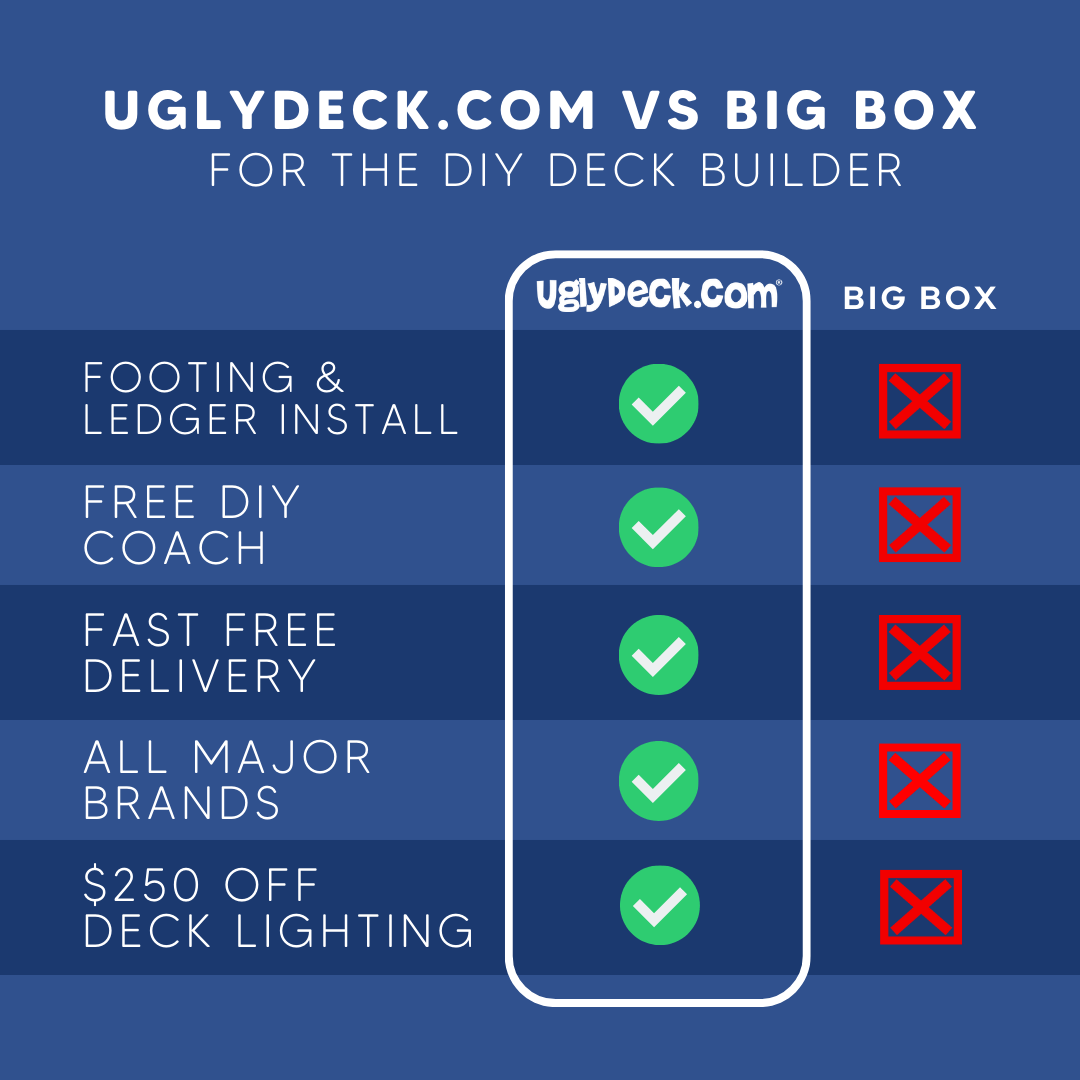 We offer prices, free delivery, and selection that is better than what Big Box stores can offer. However, it is our resources, support, and coaching that make our company a better option for the do-it-yourself deck builder in the Chicago area.